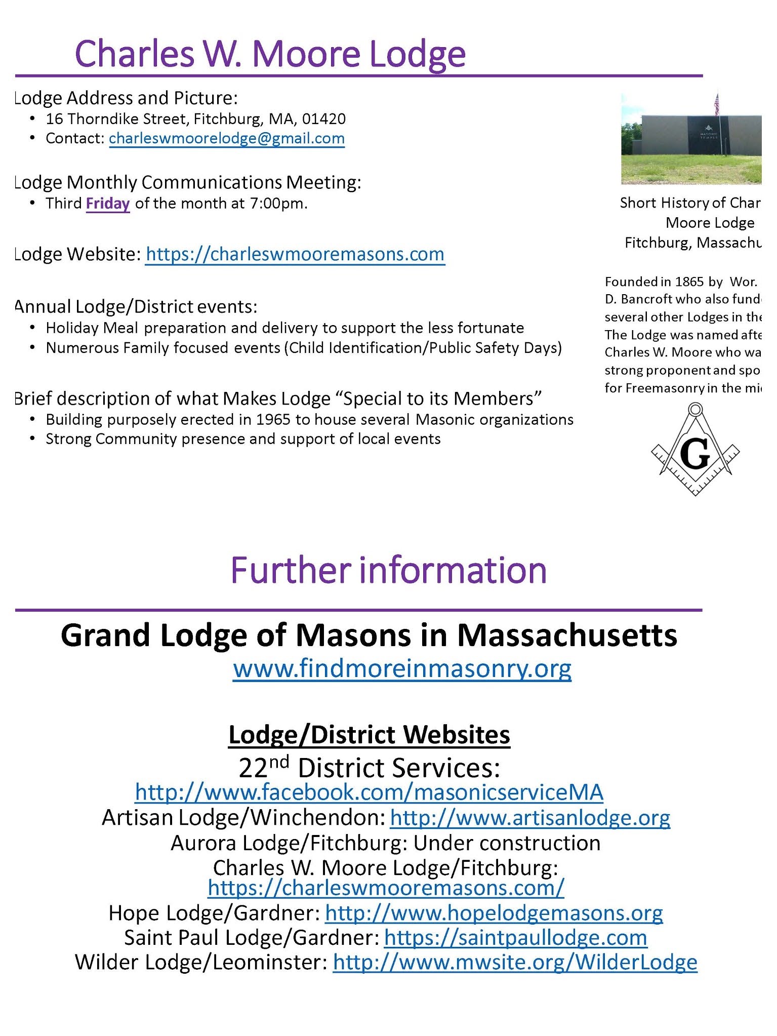 This year, as we prepare to celebrate a milestone in our history, the Brothers of Charles W. Moore Lodge are making a renewed commitment to one of the primary goals of Freemasonry – making good men better. Would you like to join us in our endeavors?