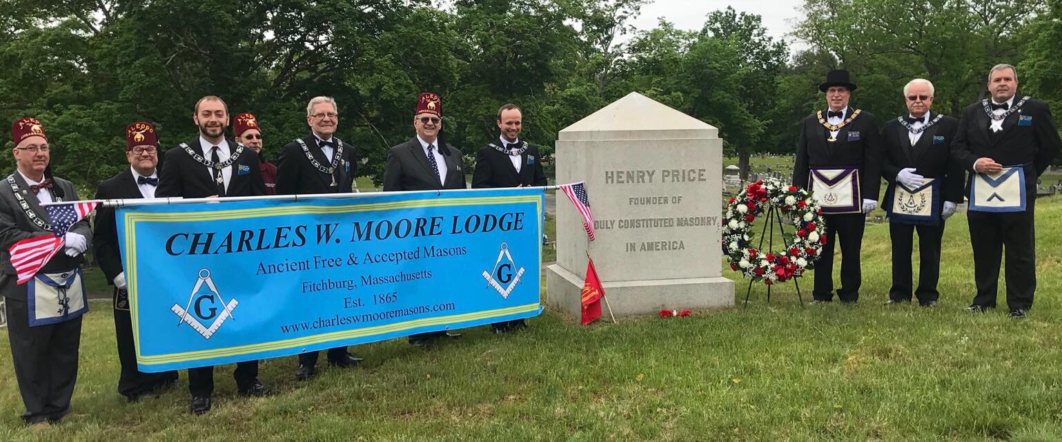 Members of Charles W Moore Lodge and the 22nd Masonic District marched in the Townsend Memorial Day Parade and paid their respects to MW Henry Price, founder of Duly Constituted Freemasonry in The United States.