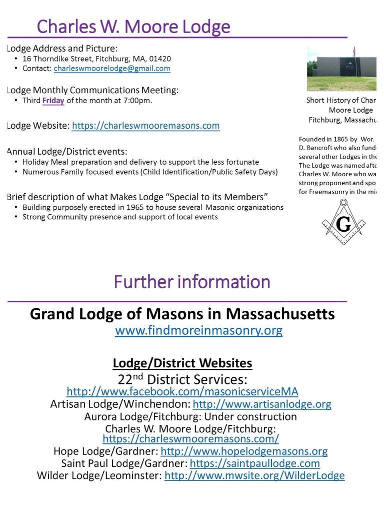 Charles W. Moore Lodge in Fitchburg Massachusetts, is an active member of the fraternal organization of American Freemasonry. We provide a forum which summons and provokes all men of faith and honest character to be their best. It is our belief that the result of this collective spirit promotes stronger men, families and communities.